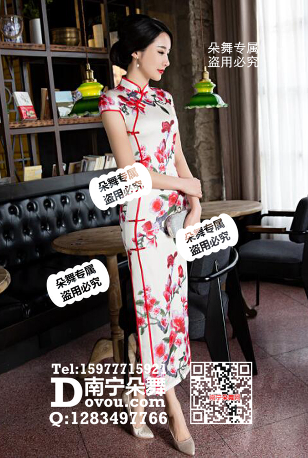 白底红花长旗袍