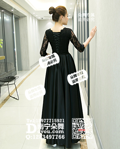 黑色蕾丝中袖蝴蝶结修身长裙礼服
