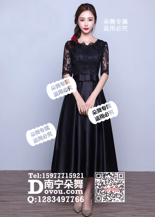 黑色蕾丝中袖蝴蝶结修身中裙礼服