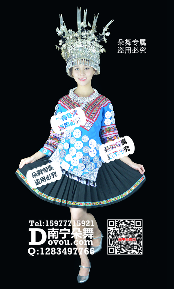 蓝衣斜襟银片黑短裙苗族