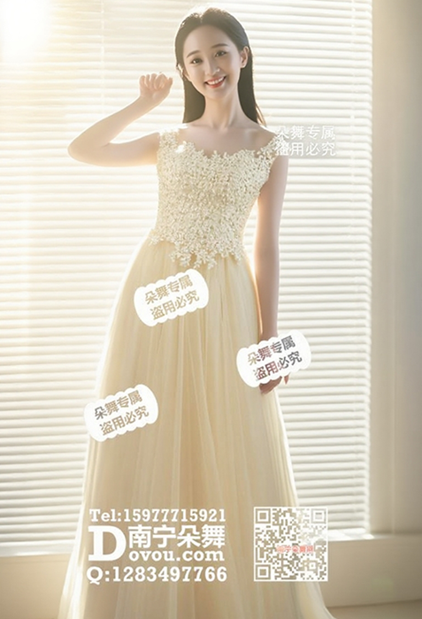 香槟色V字肩水钻鱼鳞绣花长礼服
