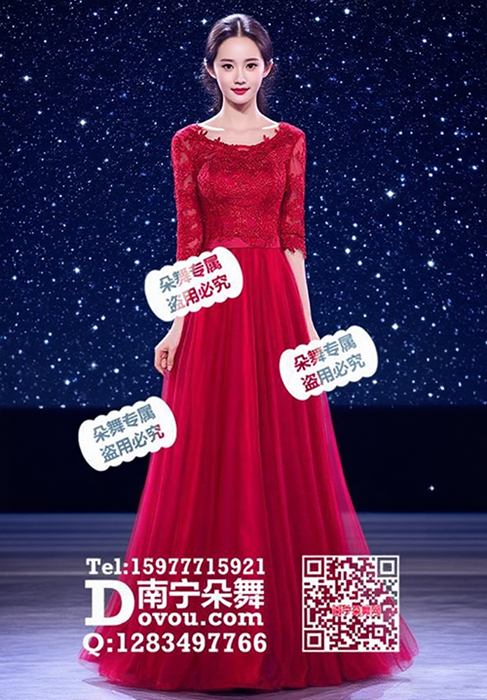 大红蕾丝中袖圆领纱裙长礼服