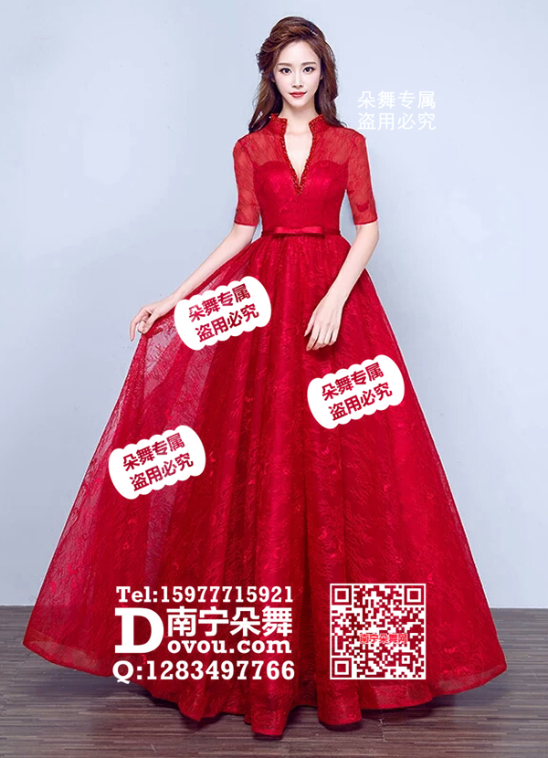 红色深V亮钻蕾丝中袖晚礼服