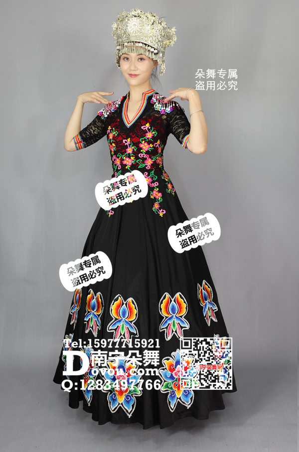 黑色大蓝花蕾丝中袖苗族盛装