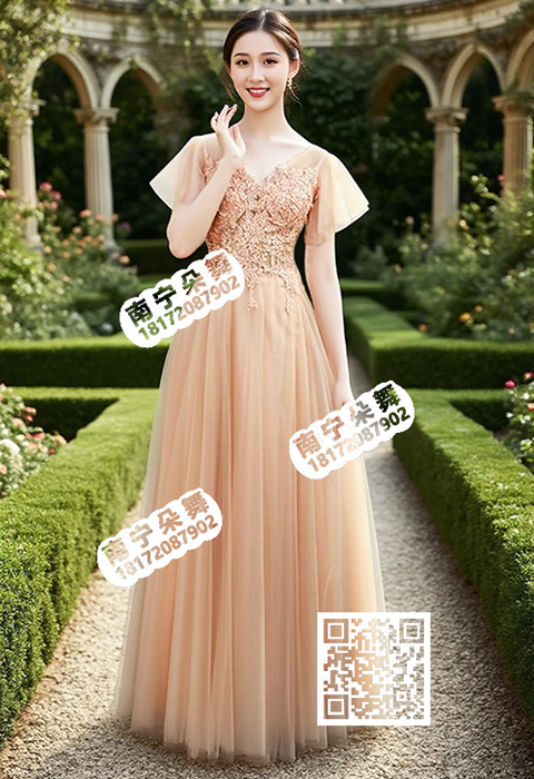 香槟色V字肩水钻鱼鳞绣花长礼服