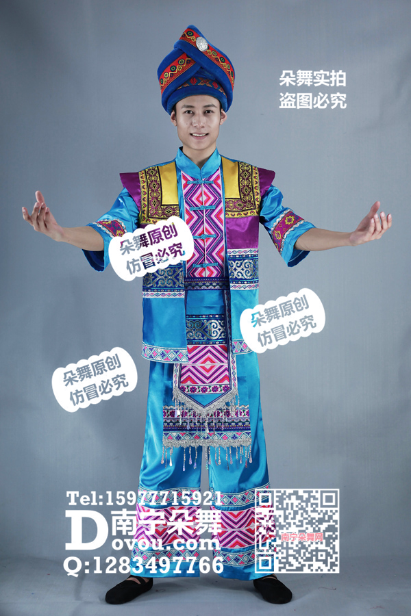 蓝色玫红菱纹壮族男装