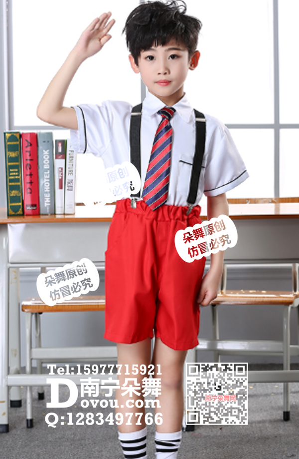 白衣红背带裤男童套装