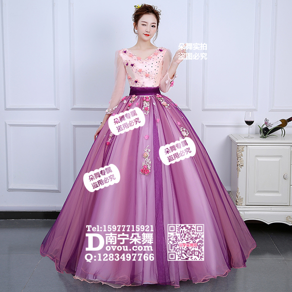 粉衣V领紫裙多花大礼服