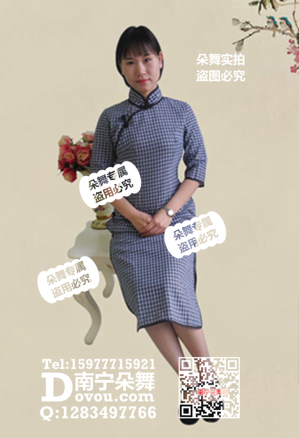 简单描述: 蓝紫色格子民国中袖长旗袍