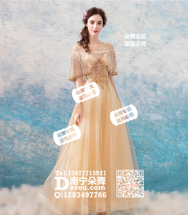 简单描述: 香槟色圆领透纱蕾丝披肩裙长礼服
