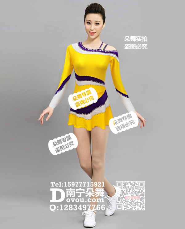 简单描述: 黄色紫白斜肩长袖体操啦啦操短裙