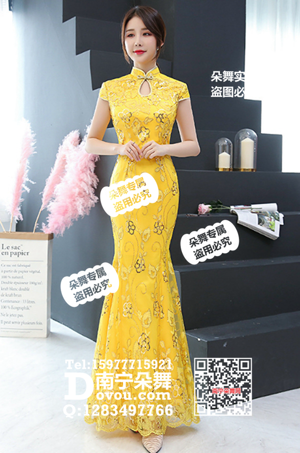 简单描述: 黄色蕾丝鱼尾长旗袍