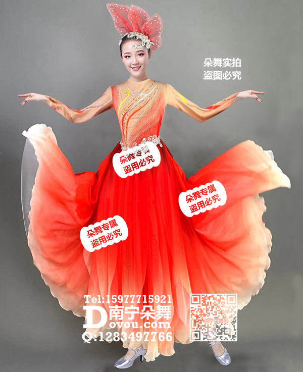 适合题材 红橘渐变亮钻花瓣大摆裙