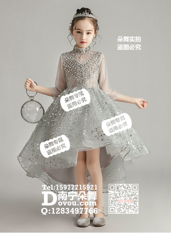 灰色立领亮钻拖尾纱裙女童礼服