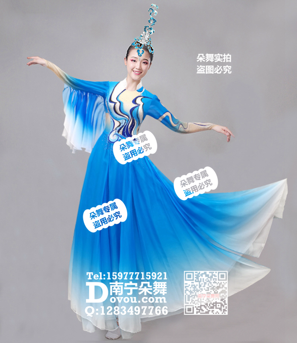 简单描述: 蓝白水月渐变单边波浪袖长裙