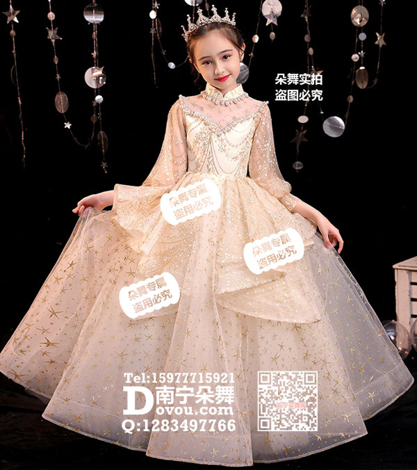 简单描述: 米黄立领灯笼袖金星网纱女童礼服