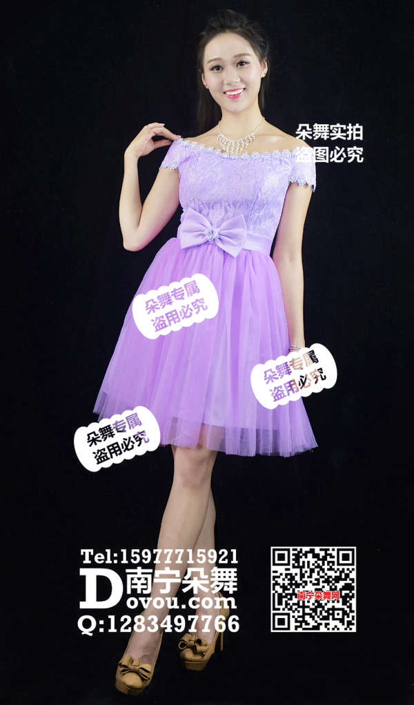 适合题材 紫色小花一字肩纱裙短礼服