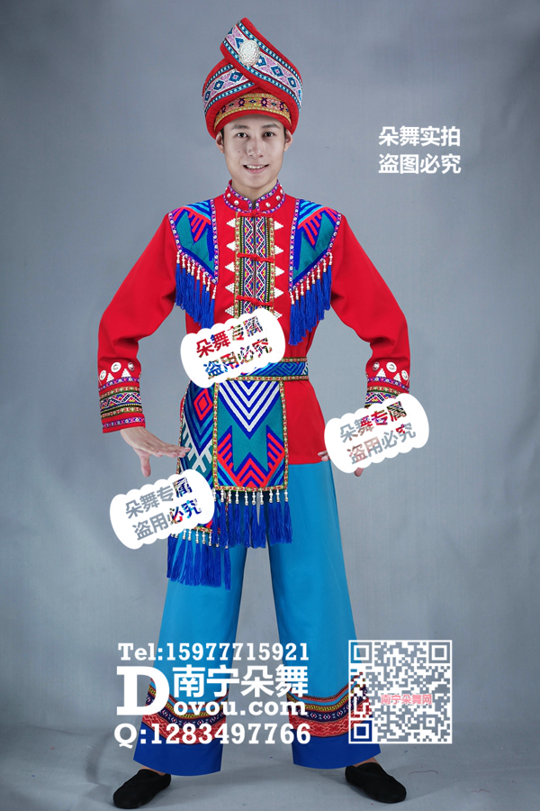 适合题材 红衣蓝吊须肩蓝裤壮族男装