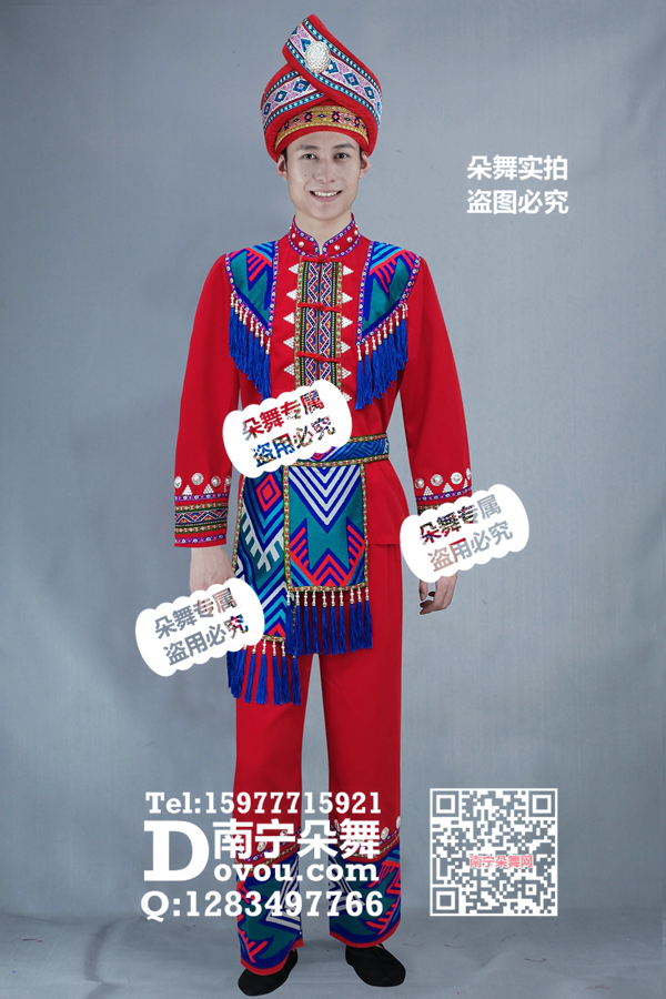 简单描述: 红色蓝吊须肩长袖壮族男装