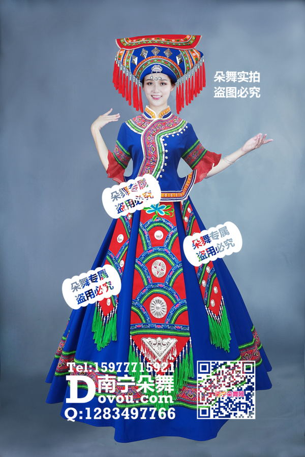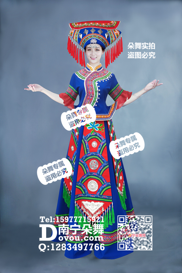 简单描述: 宝蓝翘衣角红绿腰带壮族盛装