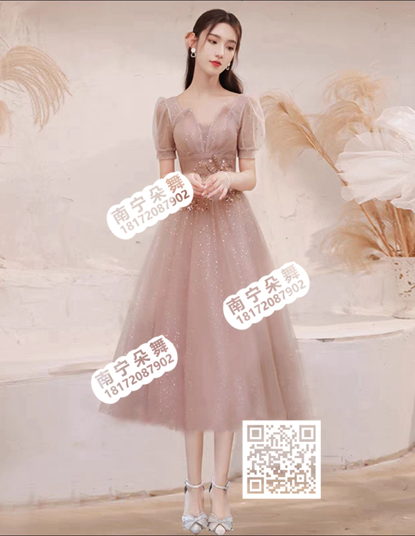 简单描述: 粉藕色泡泡袖星空网纱中长礼服