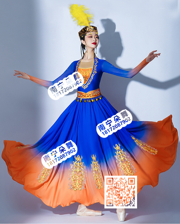 简单描述: 宝蓝橘红渐变新疆长裙