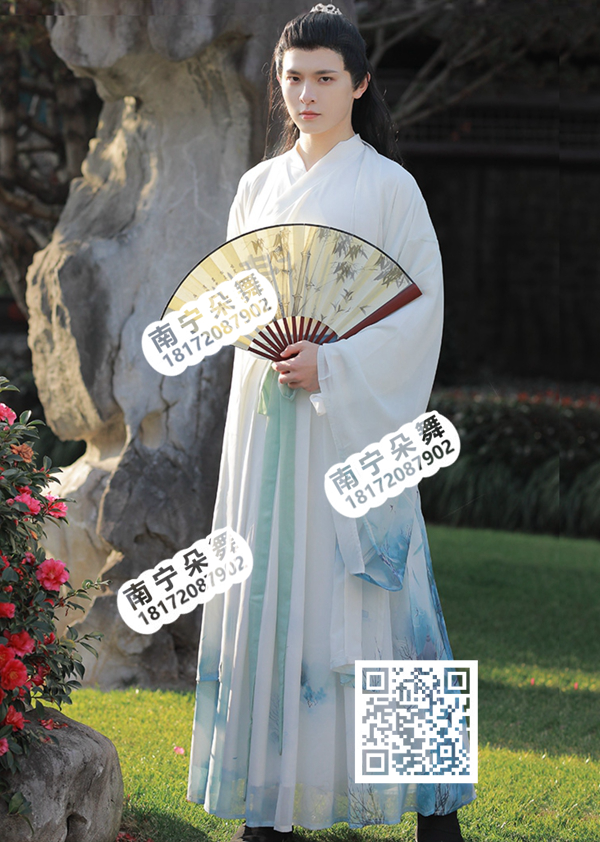 简单描述: 白蓝水墨印染大袖汉服男装