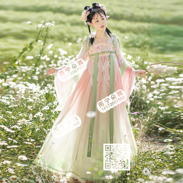 简单描述: 粉绿渐变齐胸飘袖唐风汉服