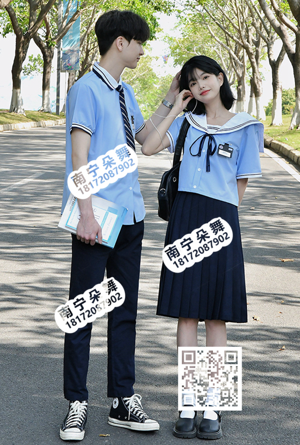 简单描述: 蓝白海军领衬衣男女学生装