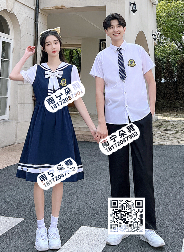 红白方海军领连衣裙白衫黑裤学院风男女套装