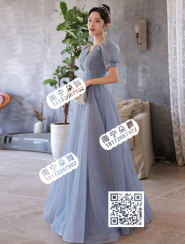 蓝色泡泡袖纱裙长礼服
