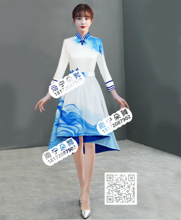 简单描述: 白蓝过渡奥运前短后长礼仪裙2