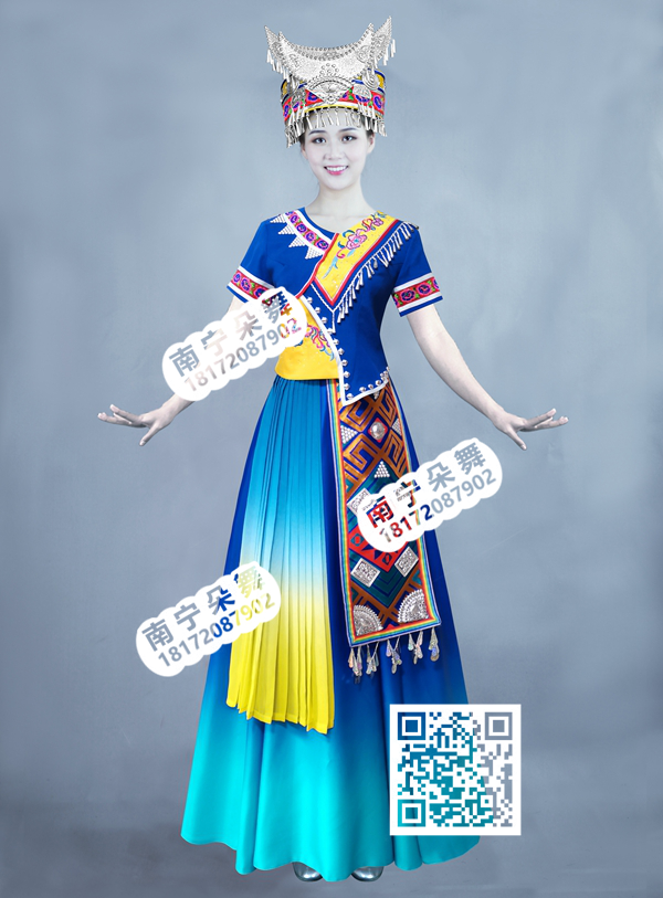 简单描述: 宝蓝红黄绣花瑶族长裙