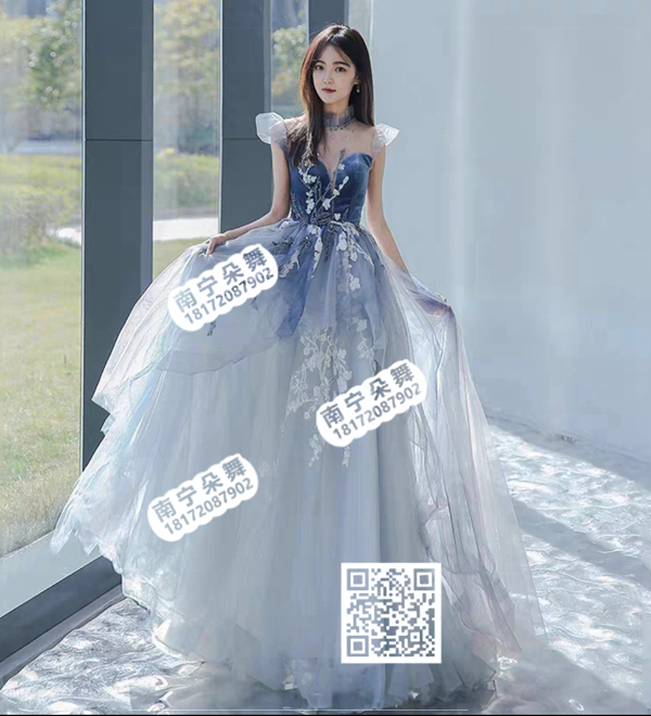 蓝色白花多纱长礼服