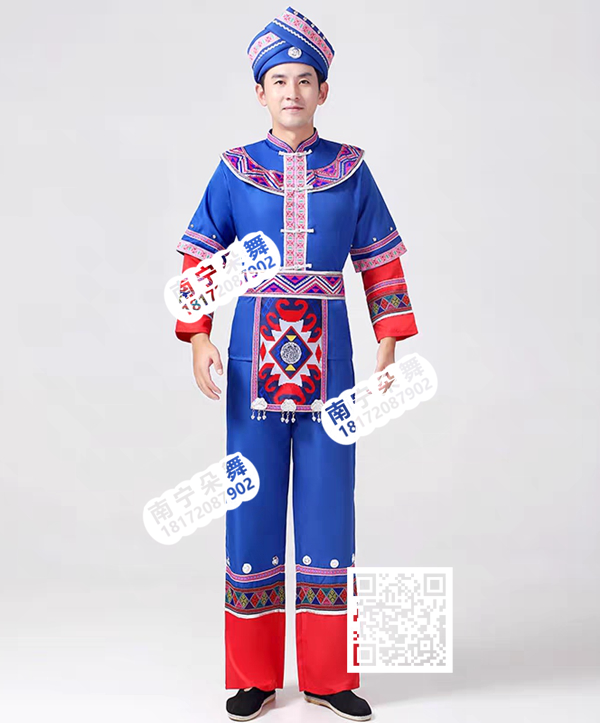 简单描述: 宝蓝红边圆领飞肩壮族男装