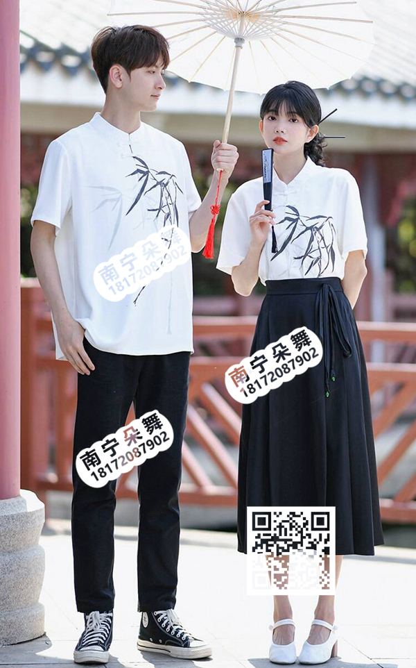 简单描述: 白衣立领竹叶新中式改良民国男女套装