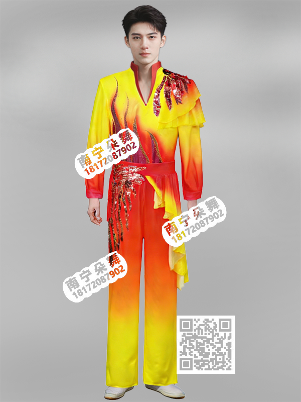 简单描述: 红黄渐变单边荷叶边亮片男装