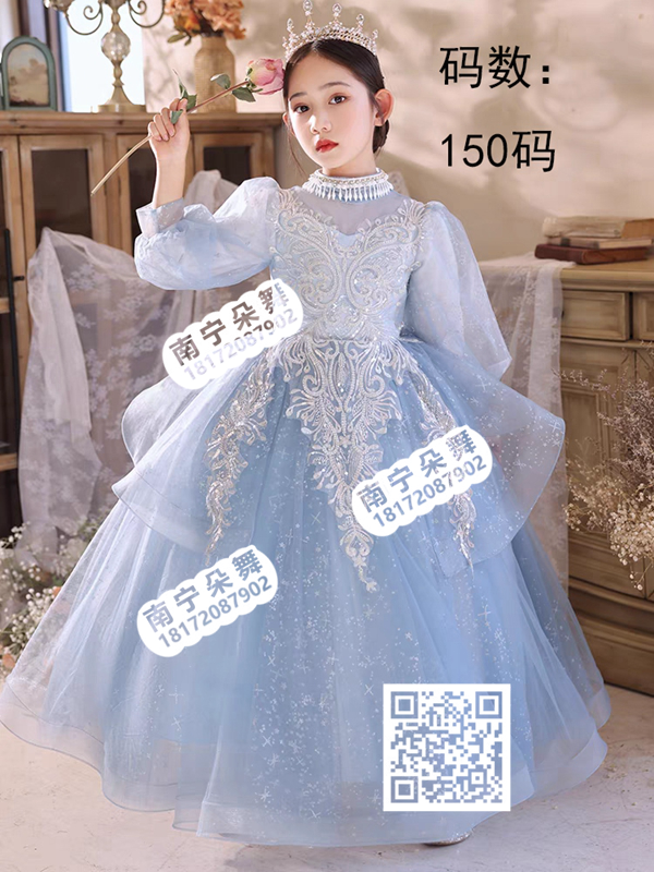 简单描述: 蓝色钉珠高领公主袖多层女童长礼服