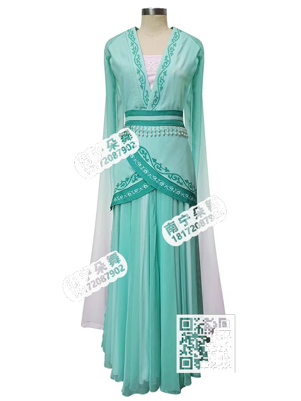 简单描述: 绿色V领水袖踏春古典