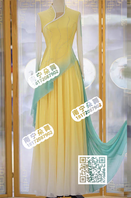 简单描述: 黄色渐变斜领无袖绿边平湖秋月古典