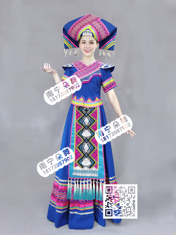 简单描述: 宝蓝飞肩多菱形腰带壮族长裙短袖
