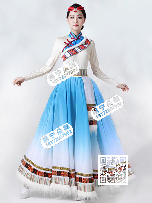 简单描述: 蓝白过渡米衣长袖藏族大摆裙