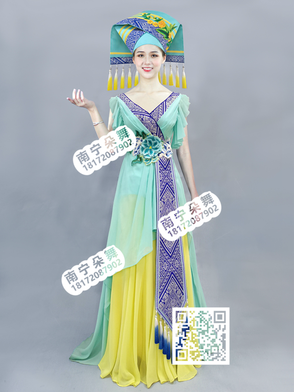 简单描述: 绿衣黄裙蓝边荷叶袖壮族长裙