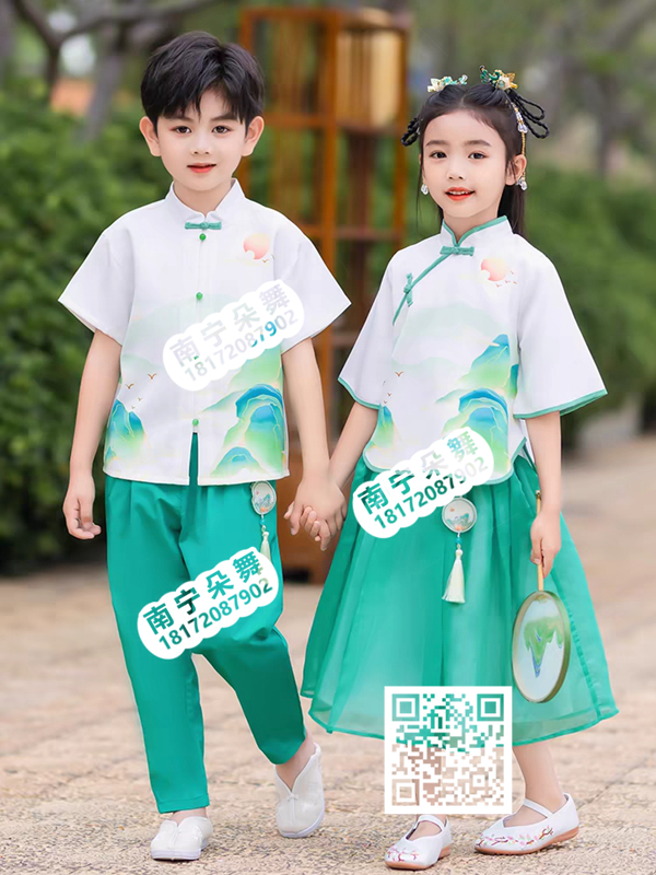 绿白山水新中式男女儿童套装