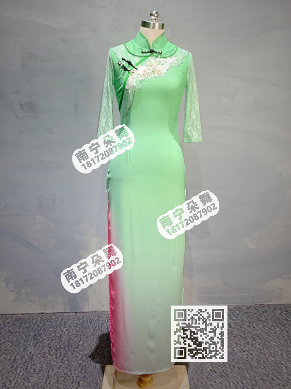 简单描述: 浅绿间玫红镂空中袖旗袍舞