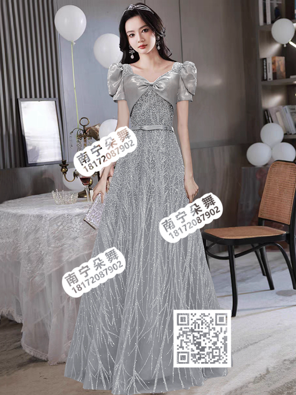 简单描述: 银灰色泡泡袖全钻闪亮网纱长礼服