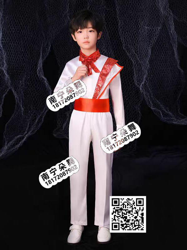 简单描述: 白衣红束带斜肩红腰白裤男童