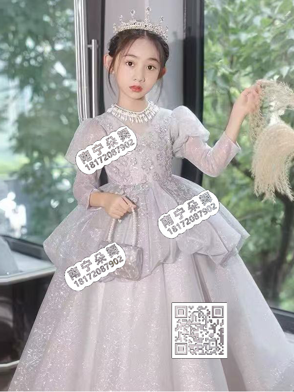 银色圆领吊珠领泡泡袖长袖女童礼服