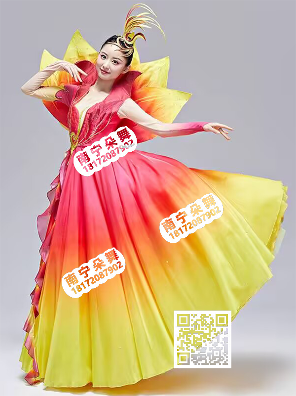 红黄渐变五片花瓣大摆裙火焰条纹V领男现代1