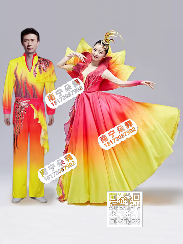简单描述: 红黄渐变五片花瓣大摆裙火焰条纹V领男现代1